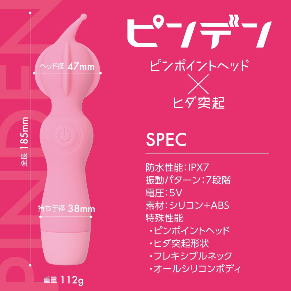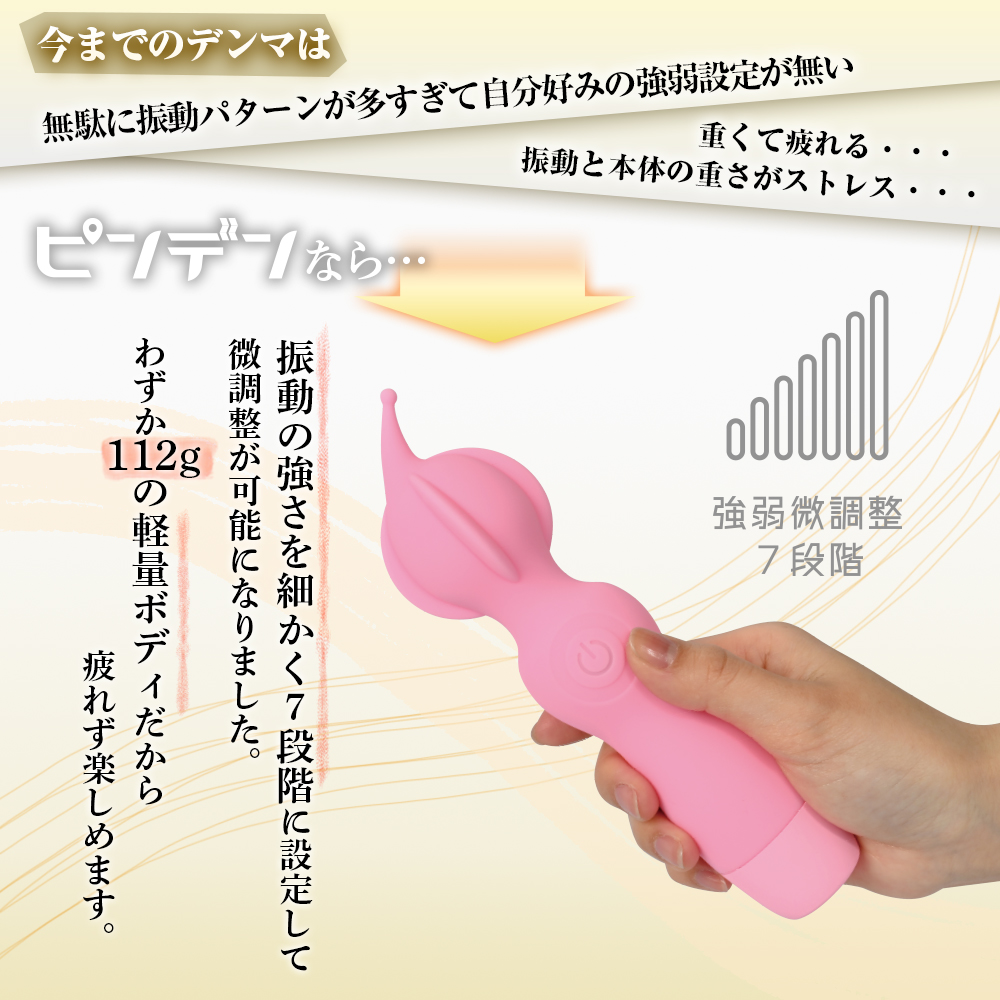 ピンデンは、快感を追求する方にぴったりのアイテムです。その特殊な形状やパワフルな振動機能、高品質な素材など、多くの方に満足していただけることでしょう。 先端突起がクリトリスや乳首の先端をピンポイント刺激!!ヒダは割れ目にフィット!もちろん普通のデンマスタイルも可能なので色々な楽しみ方が出来ますよ。 従来のコードがついており重い電マに不満を持たれていた方はぜひお試し頂きたいです。 112グラムととても軽量なので、カップルでプレイ中にクリに当てることも出来ますし、もちろんセルフプレイでもとても気軽に使えます。 高品質なシリコン素材で作られており、安全性にも配慮されています。防水機能も備えており、お風呂やシャワーの中でも安心して使用することができます。また、使い勝手も考慮されており、持ちやすい形状やボタンの配置など、使いやすさにもこだわっています。 ピンデンは充電式であり、コードの束縛から解放されることができます。充電時間も短く、長時間の使用にも対応しています。 ピンデンの詳細情報■充電式:90分満充電で60分使用可能(※使用環境により大幅に増減します)