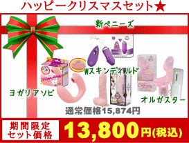 ハッピークリスマスセット★(大人気グッズをお得なセットにまとめました!)ハッピーメリークリスマス★ 天使のおもちゃ天国で人気急上昇の大ヒット商品をまとめてセットにしました! バイブ、ローター、ディルドと、このセットひとつで大満足間違いナシ♪ ★★セット内容★★ @ヨガリアソビ…クリ吸い+Gスポ刺激で恥ずかしいくらいにびしょびしょ…! A新ペニーズ…クリに当てるだけじゃない!!膣に挿入することも出来ちゃう、インサートローター Bダブルスキンディルド…皮が伸びるから上下にシゴける!本物の感触を完全再現した超リアルディルド Cオルガスター…女性のために女性自らが作ったクリトリスでオーガズムを経験する為のローター