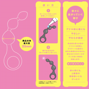 アナルボール:ぷにっとアナルトリプルボールサイズの異なる3つのボールが刺激的な快感を与えてくれる♪ 先端のボールの最大径が1.5cmだからアナニー初心者にもおすすめ。 3つめの最大径は2.5cm。これから拡張をしていきたい方にもおすすめです。 アナル用のローションをたっぷりつけてご使用下さいね。 ぷにっとアナルトリプルボールの詳細情報■商品重量:60グラム