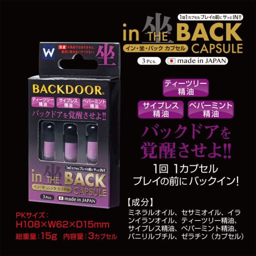 イン・坐・バック カプセル(アナル用カプセルオイル)イン・坐・バック カプセル(アナル用カプセルオイル)■3カプセル入り イン・坐・バック カプセルはアナルに挿入するタイプの商品です。 カプセルは約37℃の体温で溶け始め、10分ほどで内部のオイルがアナル全体になじむように広がっていきます。 純日本製 ティーツリー精油、サイプレス精油、ペパーミント精油など日本国内の工場で丁寧に生産されたものだけを採用。すっきりとした香りと清涼感が広がります♪ 内容成分:ミネラルオイル、セサミオイル、イランイランオイル、ティーツリー精油、サイプレス精油、ペパーミント精油、バニリルブチル、ゼラチン(カプセル) ※輸送時の揺れや湿度変化でまれにカプセルからオイルが少量にじみ出る場合がございます。品質や安全性に問題なくご使用いただけます。 ■使用方法:アナル使用の10分程前に1カプセルをアナルから挿入してください。 ※薬事法の関係により、イン・坐・バック カプセルの詳しい商品説明は省かせていただきます。※ご使用は自己責任でお願い致します。 ※当店では正規の取り扱い卸業者から仕入れた、正規品の媚薬のみを販売しております