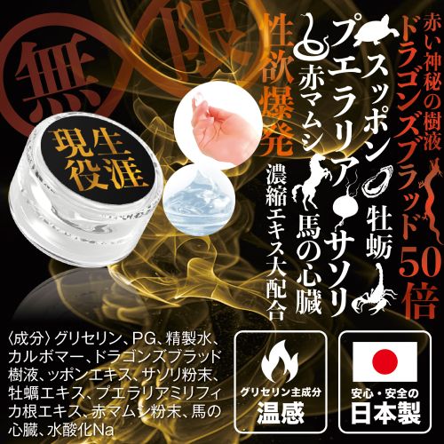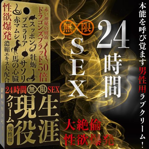 24時間無限セックスクリーム(男性用)24時間無限セックスクリーム(男性用)特別価格:2,980円 ■内容量:12g ハリウッドのセレブも愛用する南米産のラブ素材である赤い神秘の樹液「ドラゴンズブラッド」を12倍濃縮エキスで配合し大絶倫! 性欲爆発! を促す男性用の温感ラブクリーム! 刺激物に頼らない、グリセリンが主成分の温感クリームなので、媚薬特性のヒリヒリ感がありません。もちろん、安心の日本製です。 衰えを感じた男性におすすめする「男性力」が大復活するラブグッズです。 ※薬事法の関係により、詳しい商品説明は省かせていただきます。 ※当店では正規の取り扱い卸業者から仕入れた、正規品の媚薬のみを販売しております