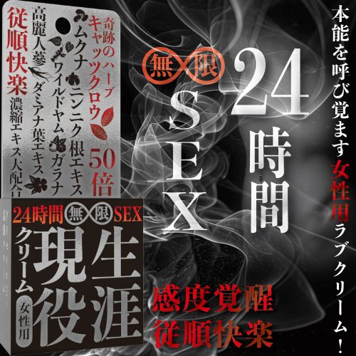 24時間無限セックスクリーム(女性用)24時間無限セックスクリーム(女性用)特別価格:2,980円 ■内容量:12g 野生を解き放つ天然の愛欲サプリの奇跡のハーブ「キャッツクロウ」を12倍濃縮エキスで配合し感度覚醒! 従順快楽! を促す女性用の温感クリーム! 刺激物に頼らない、グリセリンが主成分の温感クリームなので、媚薬特性のヒリヒリ感がありません。もちろん、安心の日本製です。 イキにくさを感じる女性が往年の悦びを取り戻すラブグッズです。 ※薬事法の関係により、詳しい商品説明は省かせていただきます。 ※当店では正規の取り扱い卸業者から仕入れた、正規品の媚薬のみを販売しております
